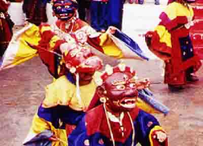 A sacred mask dance performed in the monasteries by the lamas on special festive occasions, where the lamas put on gorgeous, colourful dresses and specially prepared masks of various devils, spirits or dragons.